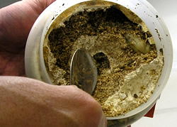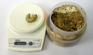 スプーンで幼虫を取り出します。幼虫には手で直接触れずに、幼虫が傷つかないようにスプーンなどで取り出すようにします。取り出したらグラム計で幼虫の体重を量り記録します。