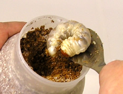 投入した幼虫の上から入れ換え前の菌糸ビンのオガ粉をふりかけると、入れ換えによる幼虫のストレスを軽減し、新しい寝床に早く慣れるようにすることができます。