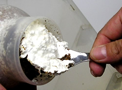 菌床上部に幼虫の体よりやや大きめの穴(空気だまりをつくり、通気をよくするため)を掘ります。その中にスプーンで幼虫を静かに投入してください。
