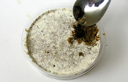 幼虫を投入したら、今まで幼虫が食べていたオガクズや幼虫の糞等をひとつまみ程度、上から振りかけます。