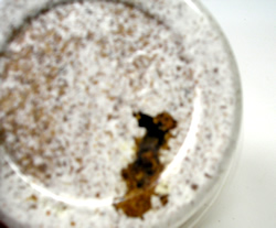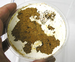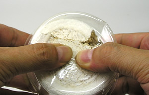 幼虫の居場所がわかれば、逆さにしてカップ裏面から中身を押し出して幼虫を取り出します。幼虫をつぶさないように注意してください。幼虫の居場所がわかりにくいときは、特に優しく丁寧に中身を取り出します。取り出したらグラム計で幼虫の体重を量り記録します。