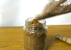 すりこぎ棒で詰めていきます。詰めが堅すぎるとオガ粉とオガ粉の間の隙間がなくなり酸素不足の状態になってしまいますので、詰めすぎにご注意ください。